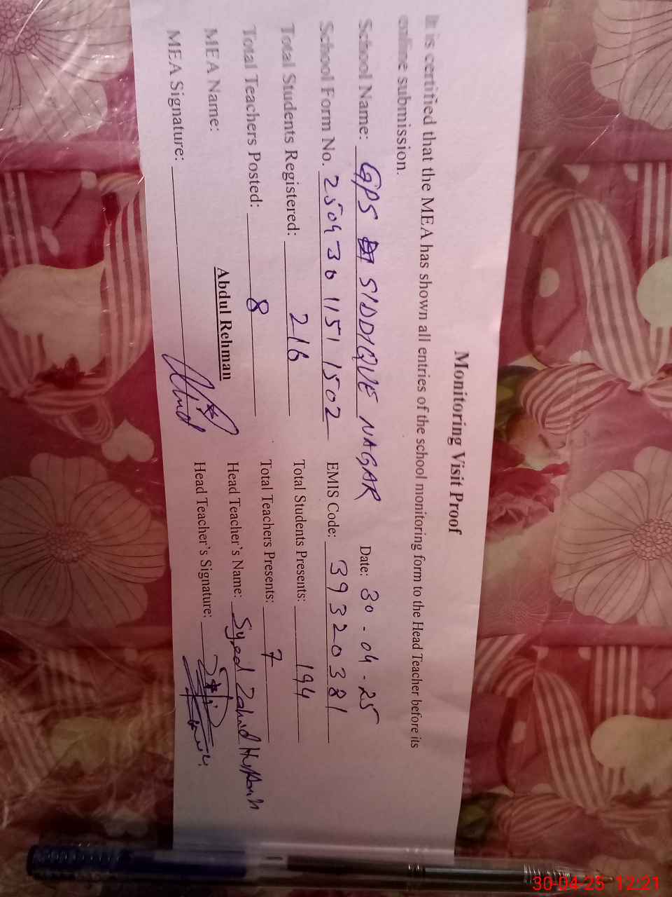 | EMIS Code: 39320381 | Name of School: GPS SIDDIQUE NAGAR | |||