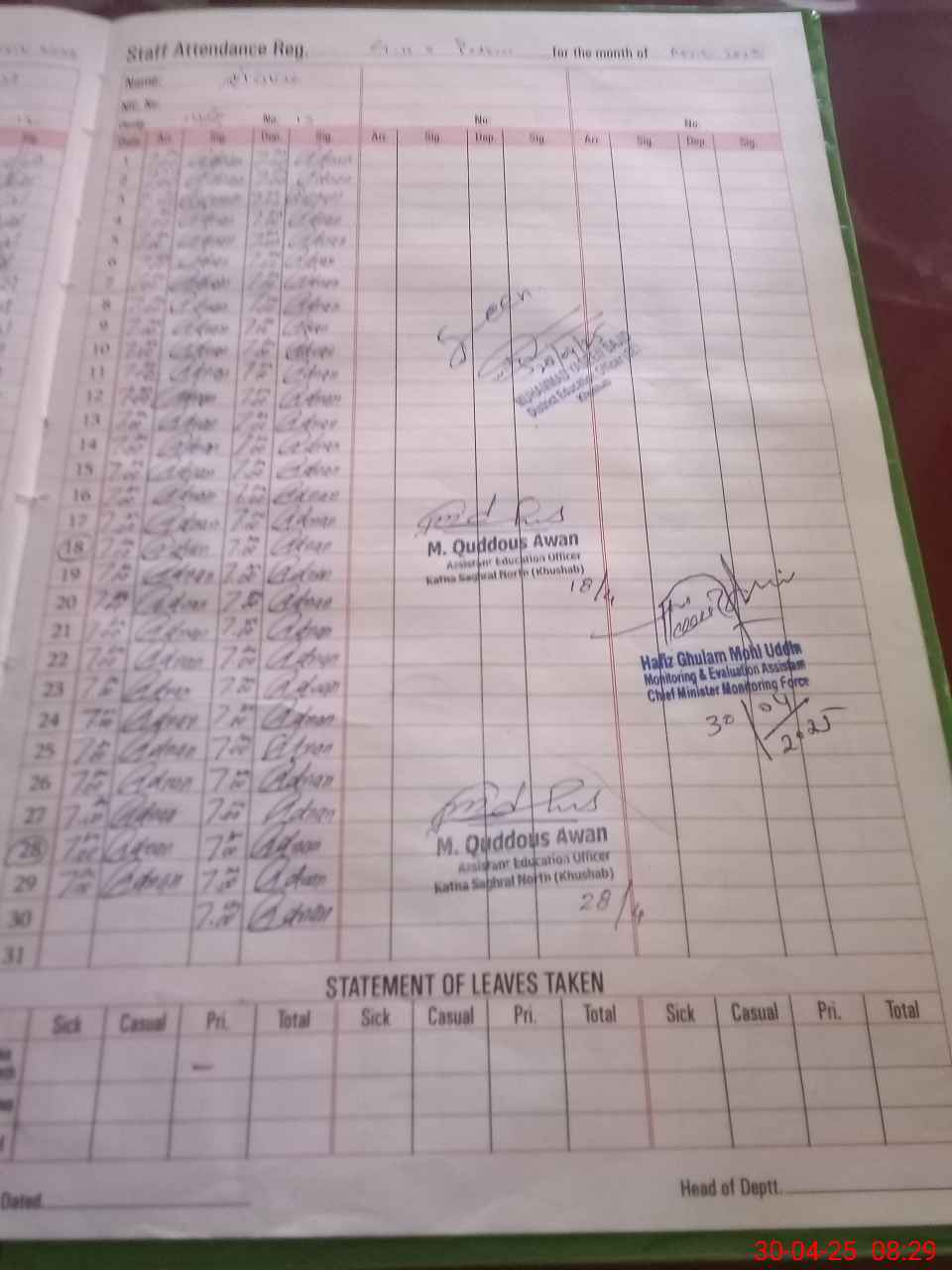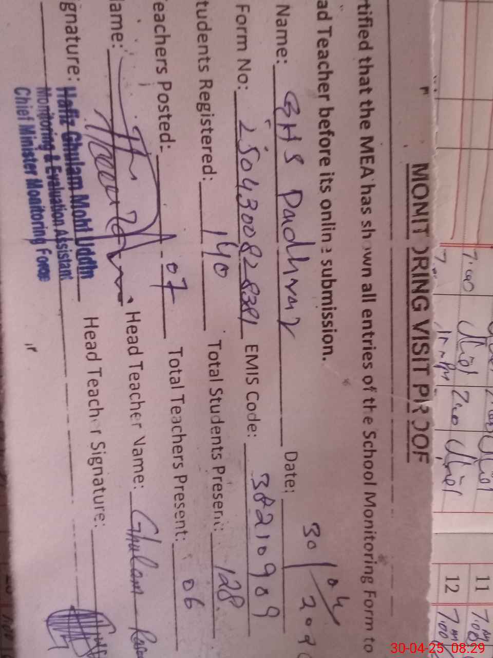| Name: Gh**** Ra**** Designation: (School Headmaster's/Headmistress's) S S T Science Phone/Cell Number: 03**** |