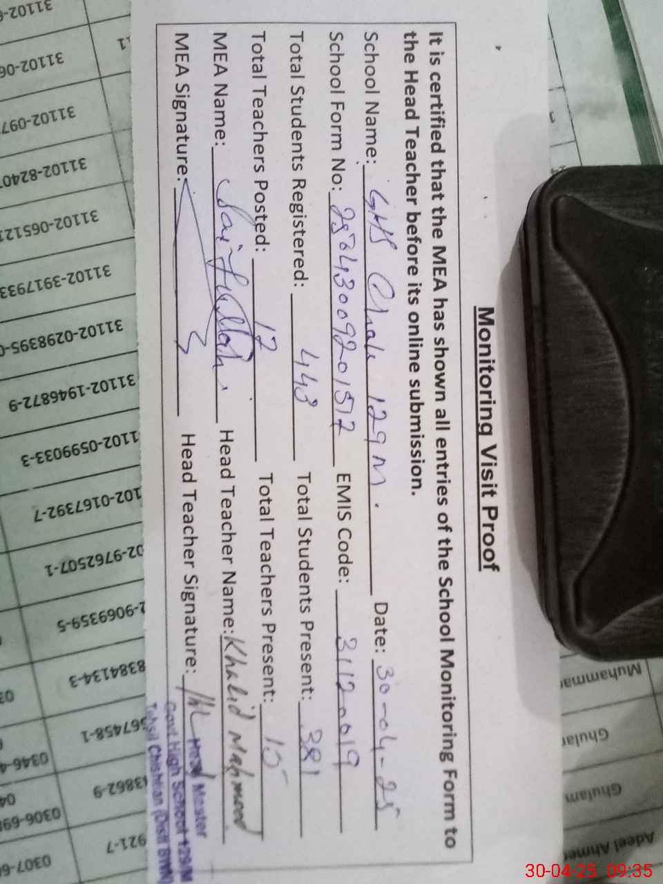 | Attendance Register | Head Teacher | MEA with School | Visit Proof |