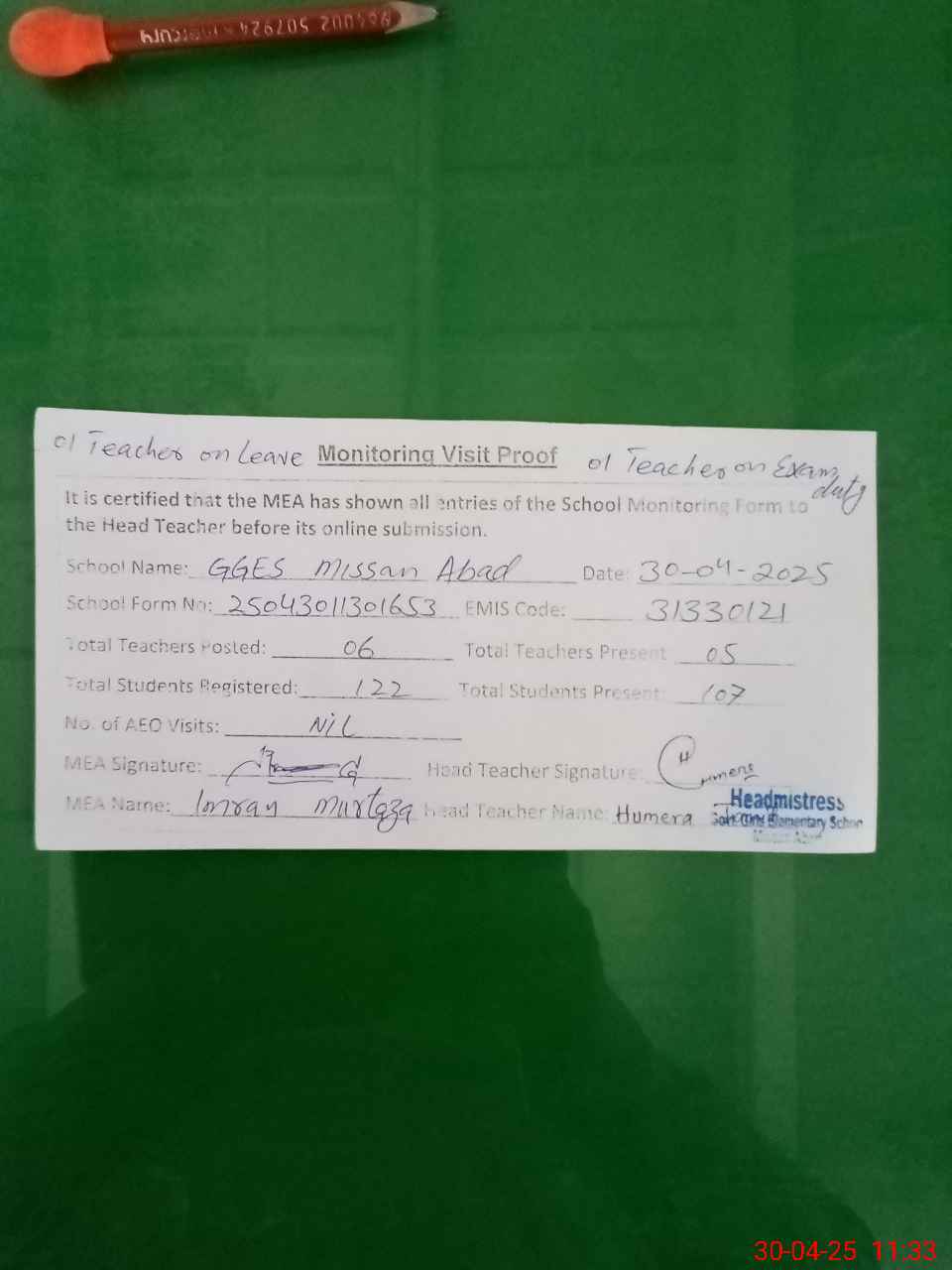 | Remarks (Use Separate Page if Required): The school is running in GHS Missan Abad due to whole building is dangerous of GGES Missan Abad | |||||