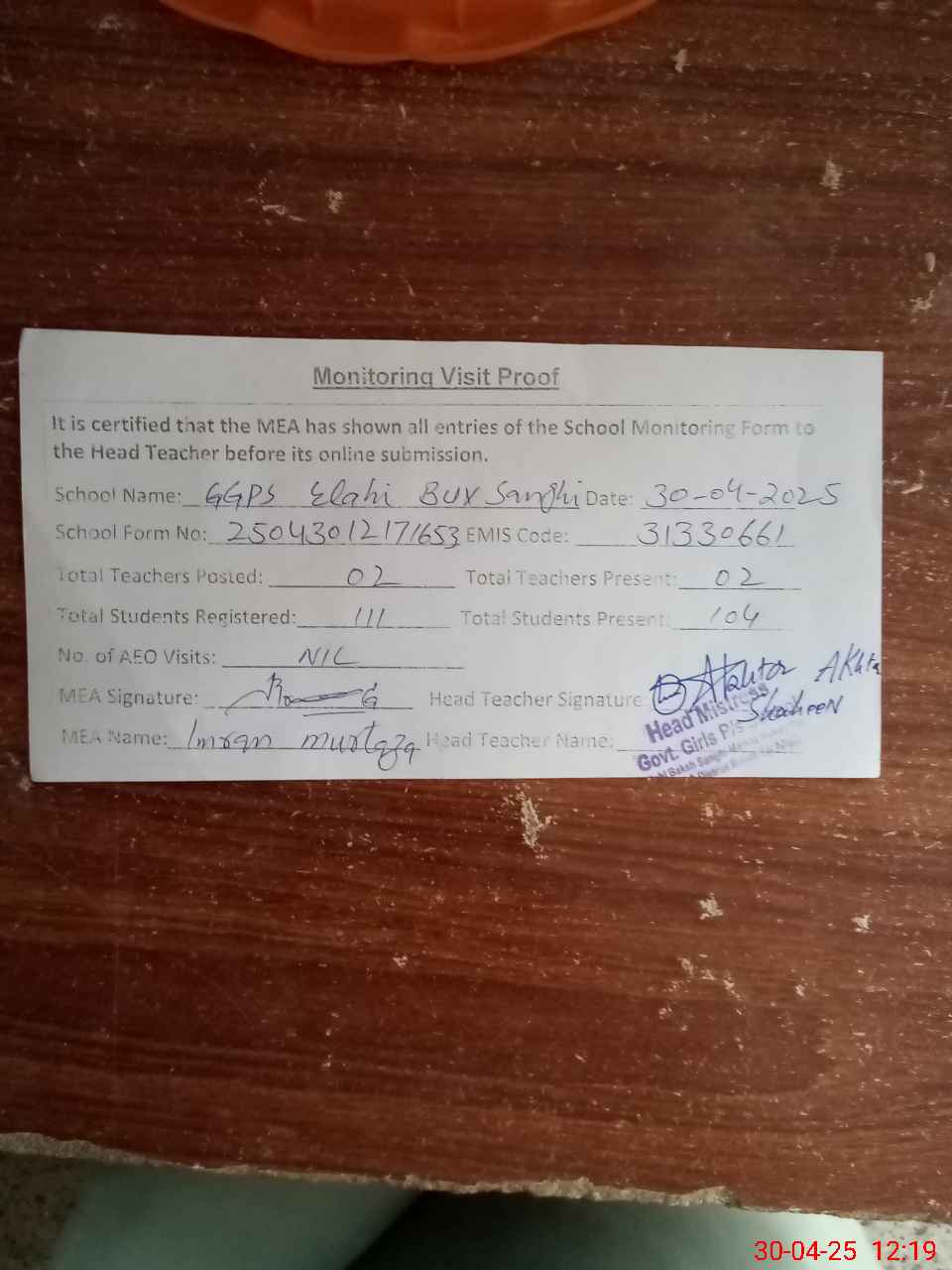 | Attendance Register | Head Teacher | MEA with School | Visit Proof |