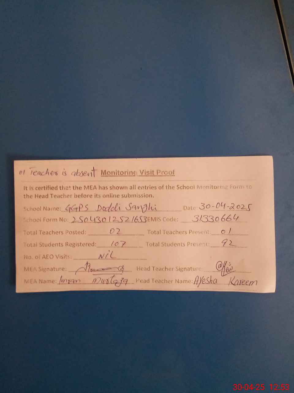 | EMIS Code: 31330664 | Name of School: GGPS DODDI SANGHI BASTI MASTER KHUDA BUX MAHER | |||
