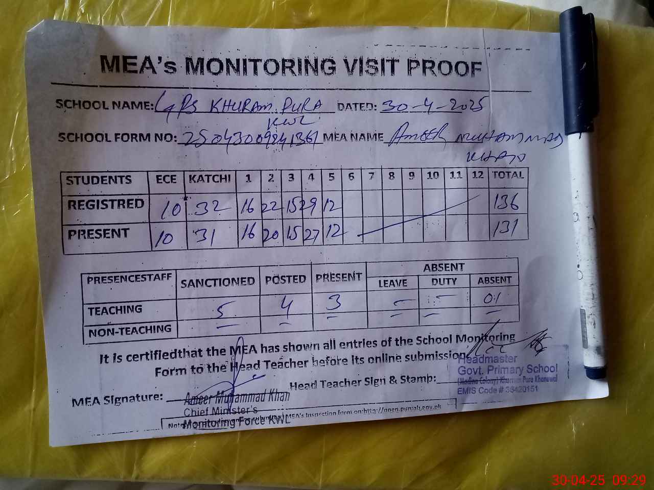 | EMIS Code: 36420151 | Name of School: GPS KHURRAM PURA, MADINA COLONY, KHANEWAL | |||