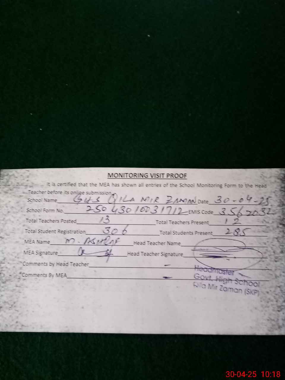 | Attendance Register | Head Teacher | MEA with School | Visit Proof |