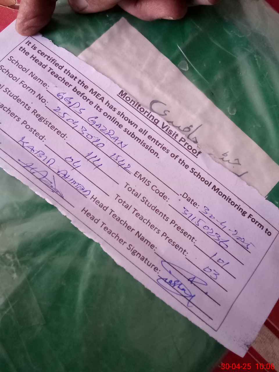 | Remarks (Use Separate Page if Required): NQ Abdul Razaq present in the school attachment here from GGES Basti Punna wali | |||||