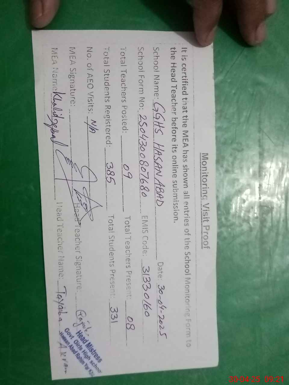 | Attendance Register | Head Teacher | MEA with School | Visit Proof |