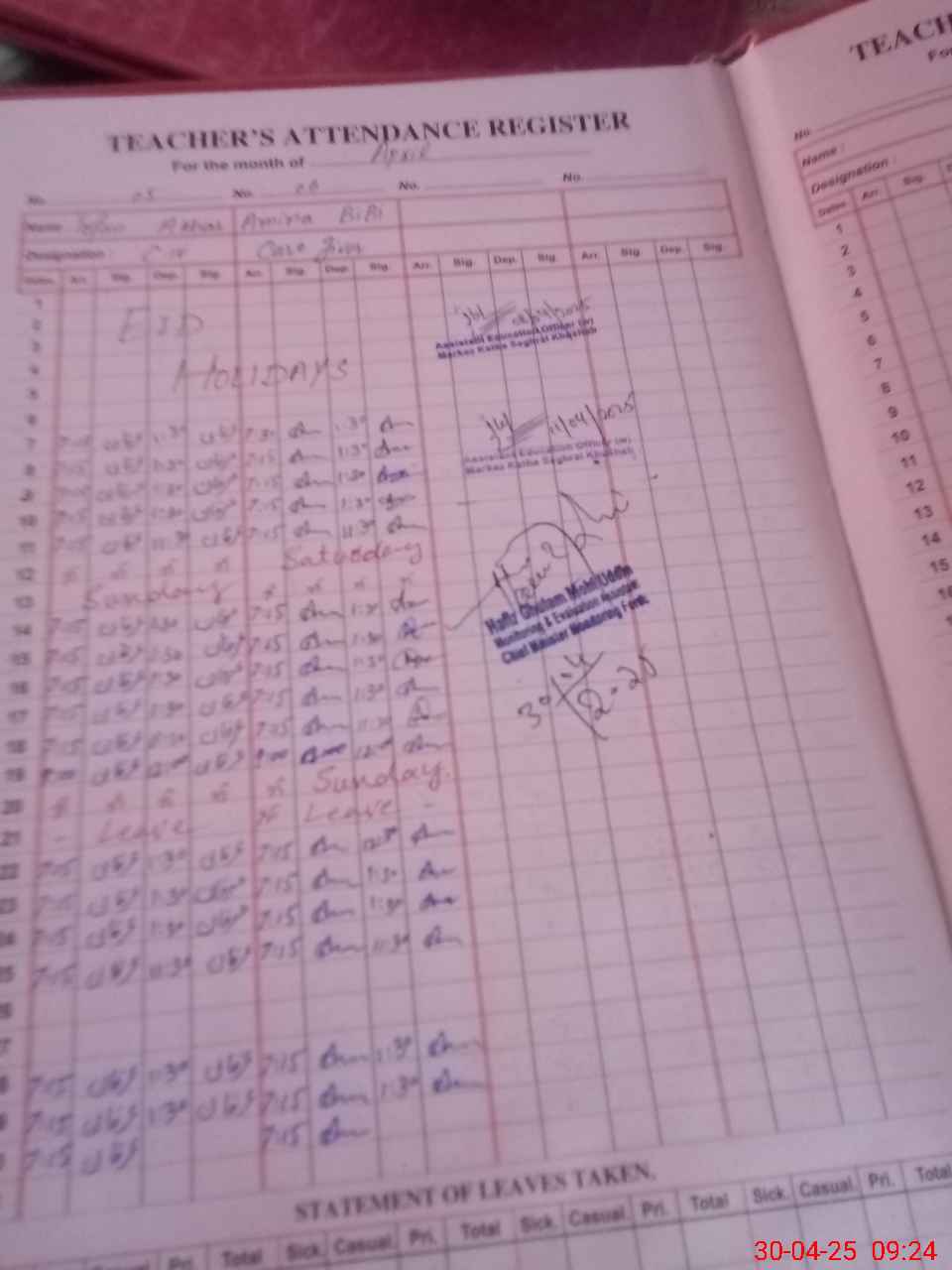 | Attendance Register | Head Teacher | MEA with School | Visit Proof |