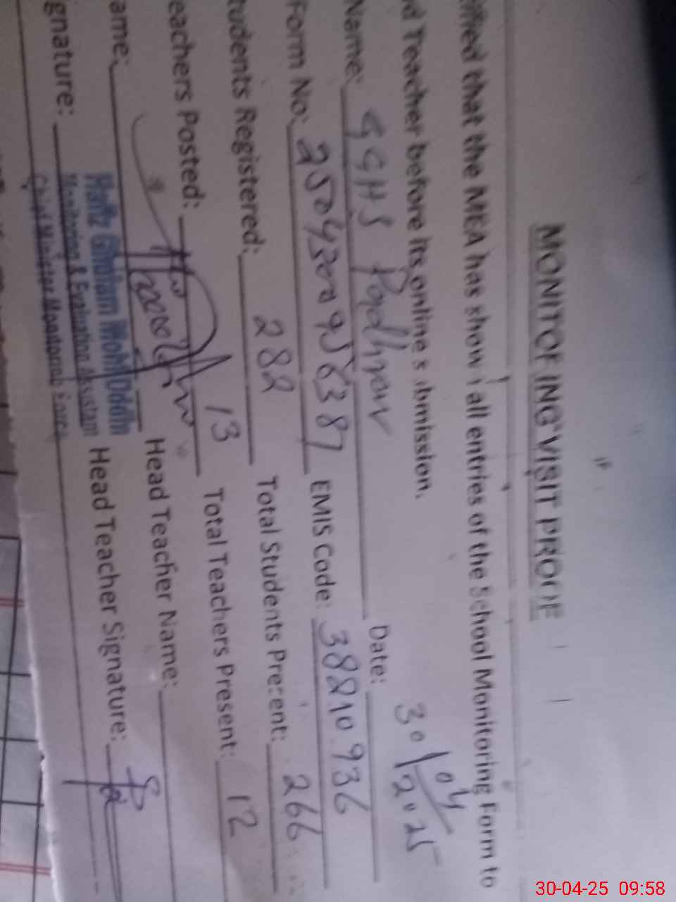 | EMIS Code: 38210936 | Name of School: GGHS PADHRAR | |||