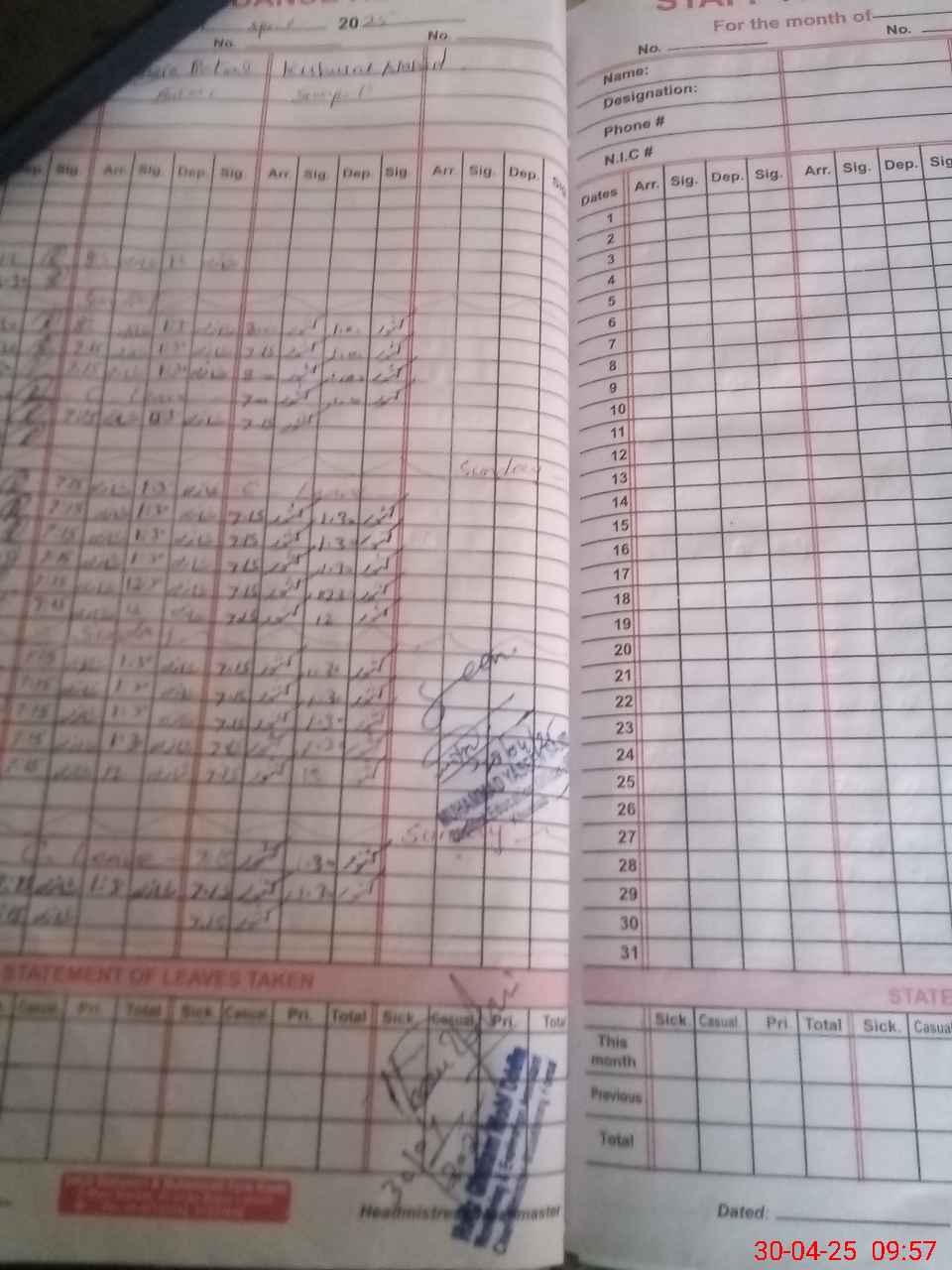 | CNIC | Full Name | Designation | R/C | Absence During Last Calender Month |