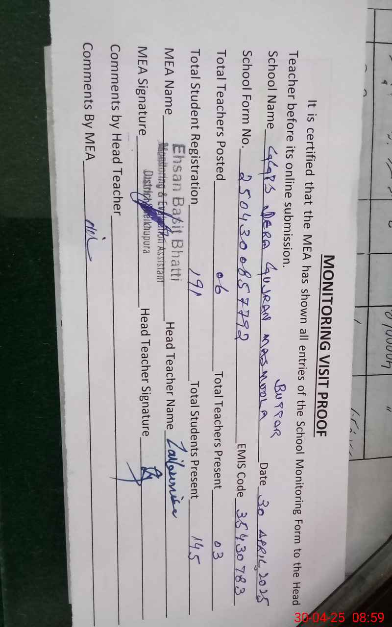 | EMIS Code: 35430783 | Name of School: GGPS DERA GUJRAN MASMOOLA BUTTAR | |||