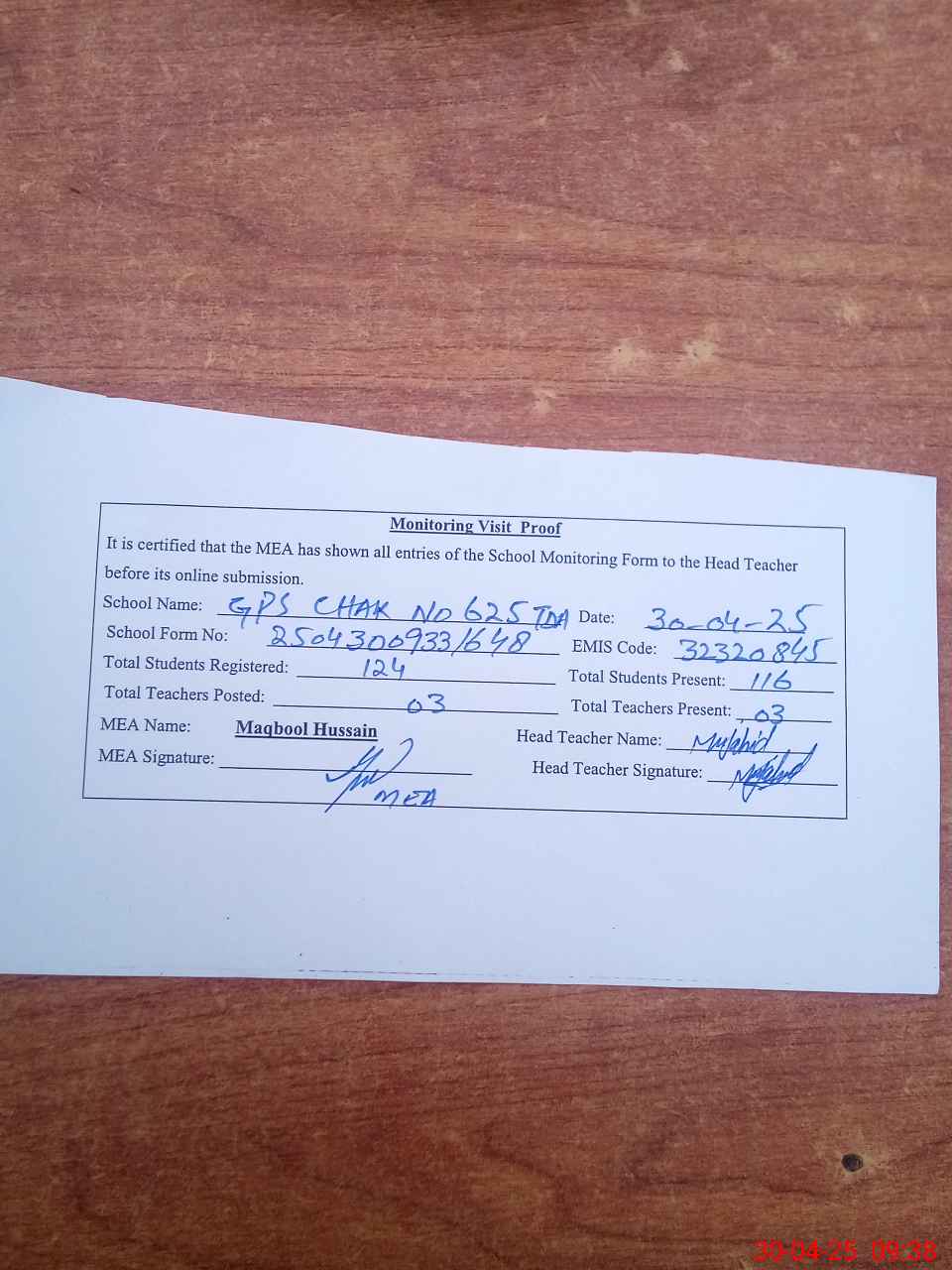 | Attendance Register | Head Teacher | MEA with School | Visit Proof |