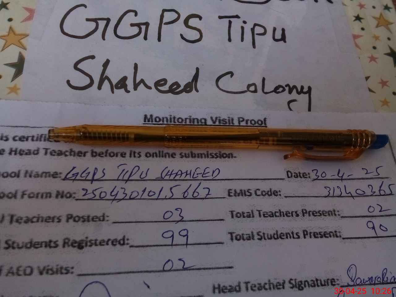 | Attendance Register | Head Teacher | MEA with School | Visit Proof |