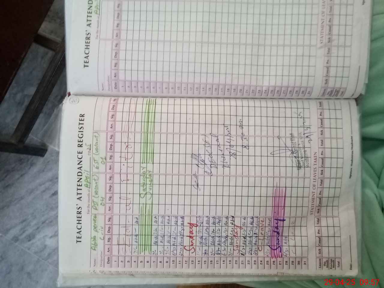 | Remarks (Use Separate Page if Required): Head teacher applied casual leave for one day on 28 April 2025 but not approved till date by concerned authority Sst Kausar Perveen CNIC 3610391753618 personal no 30278313 retried on 13 November 2024 on medical ground notification number no 1585 KNL 2024 dated 8 February 2024 but teacher name still appeared on teacher attendance list on Mea tab However said teacher has expired after few days also Please update teacher record on sis and mea tab also Books record under lock and key head teacher not present in school | |||||