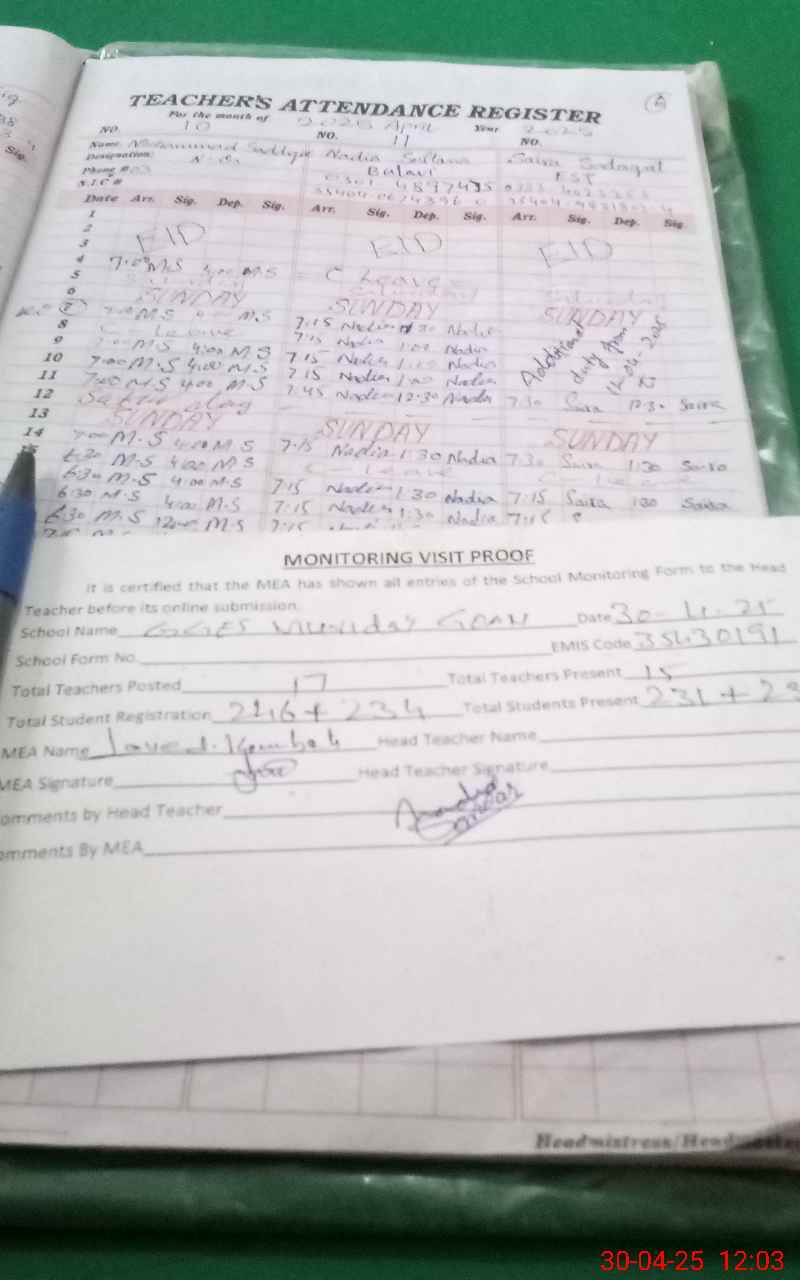 | Attendance Register | Head Teacher | MEA with School | Visit Proof |