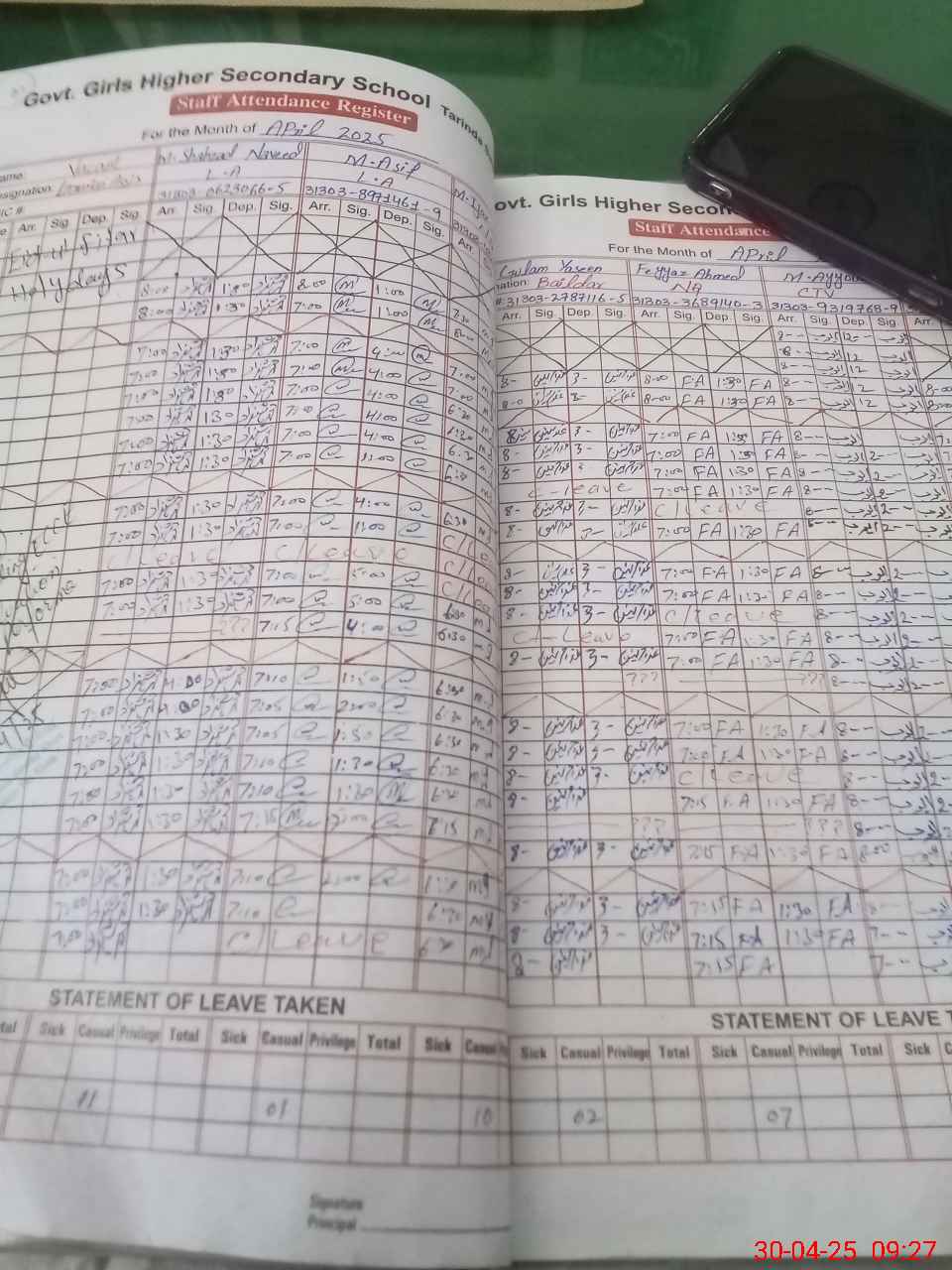 | CNIC | Full Name | Designation | R/C | Absence during last cal. month |
