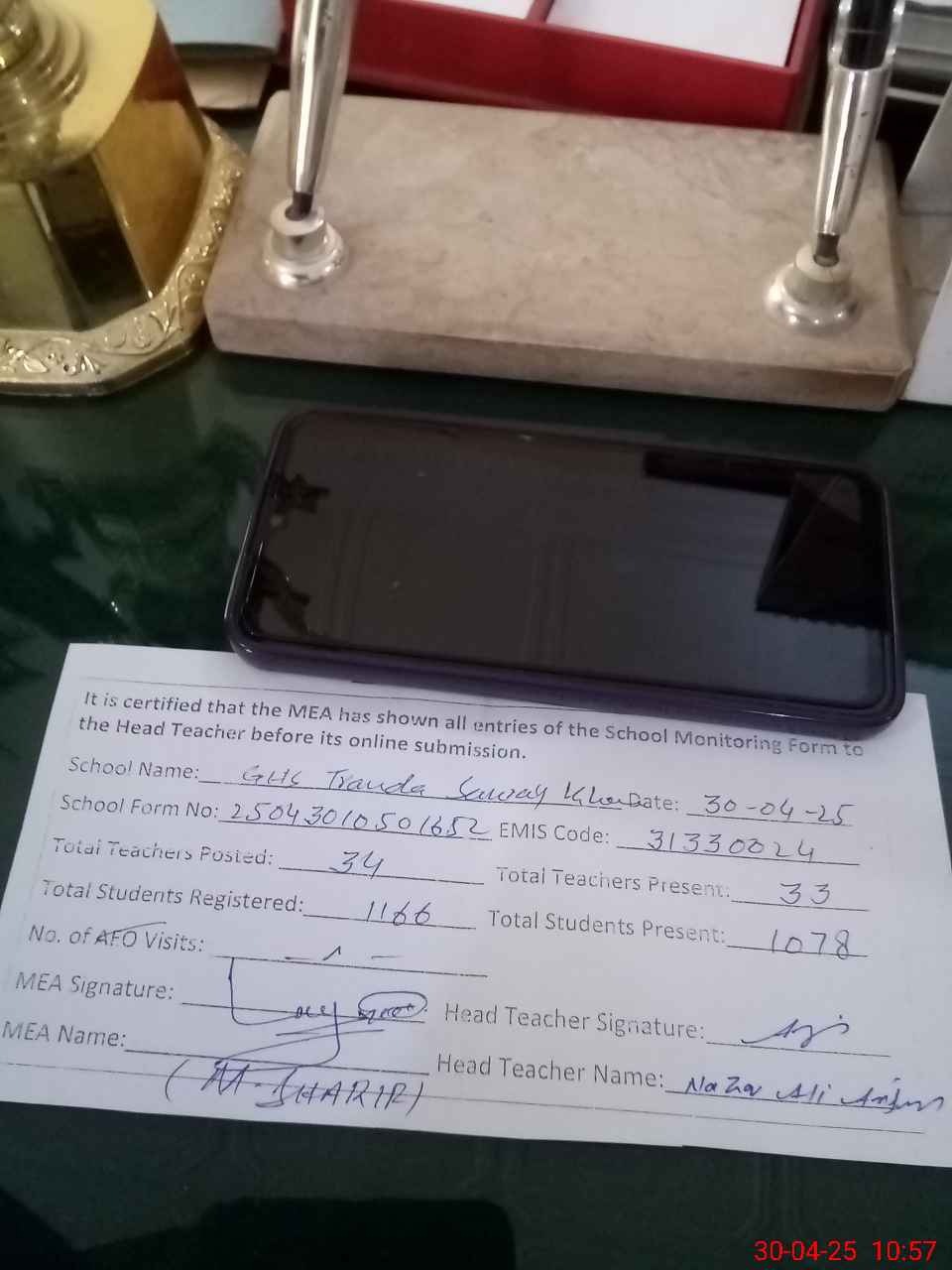 | Attendance Register | Head Teacher | MEA with School | Visit Proof |