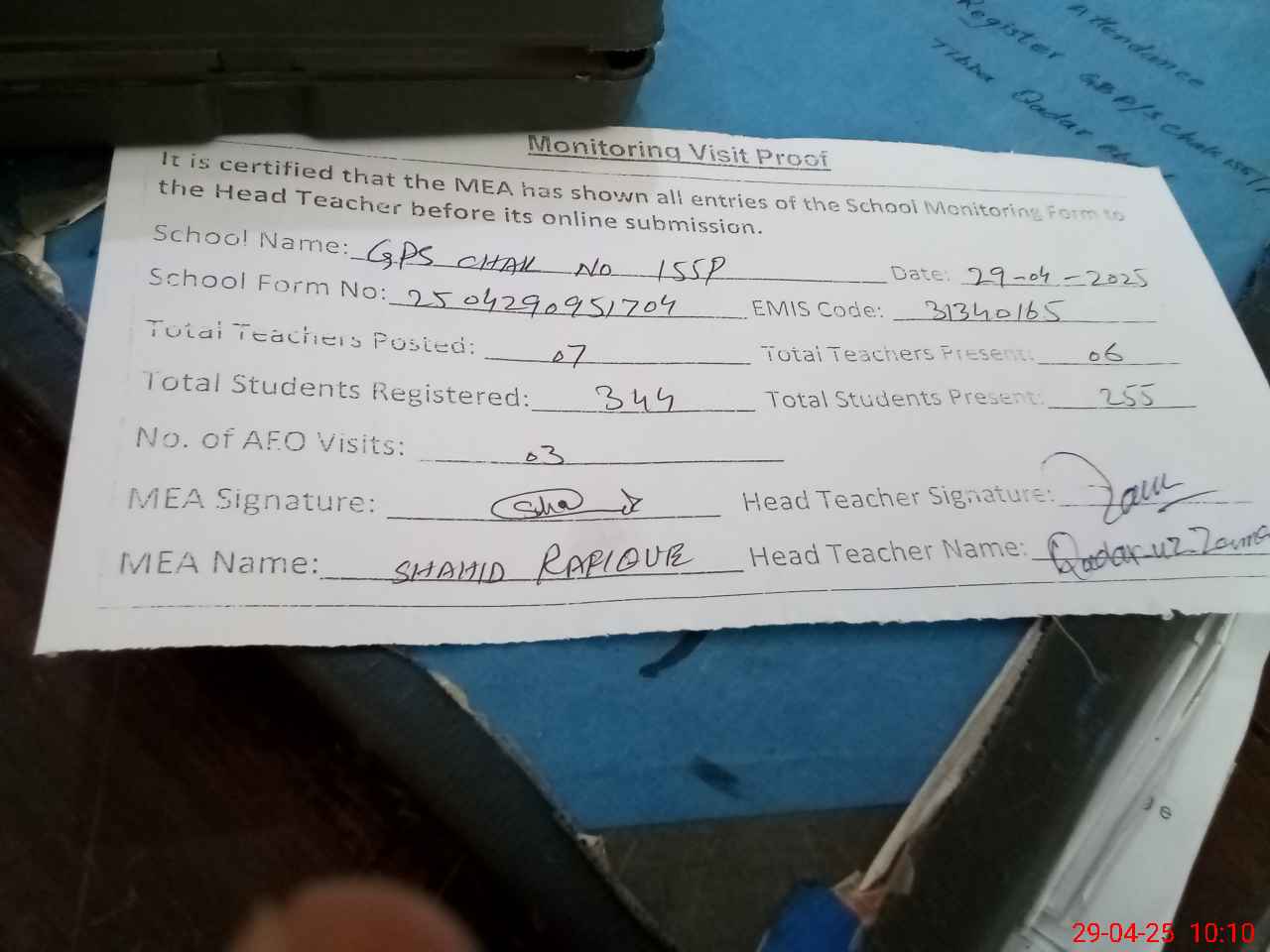 | Attendance Register | Head Teacher | MEA with School | Visit Proof |