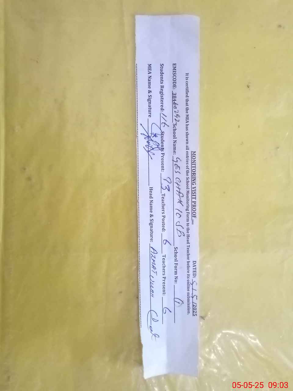 | Attendance Register | Head Teacher | MEA with School | Visit Proof |