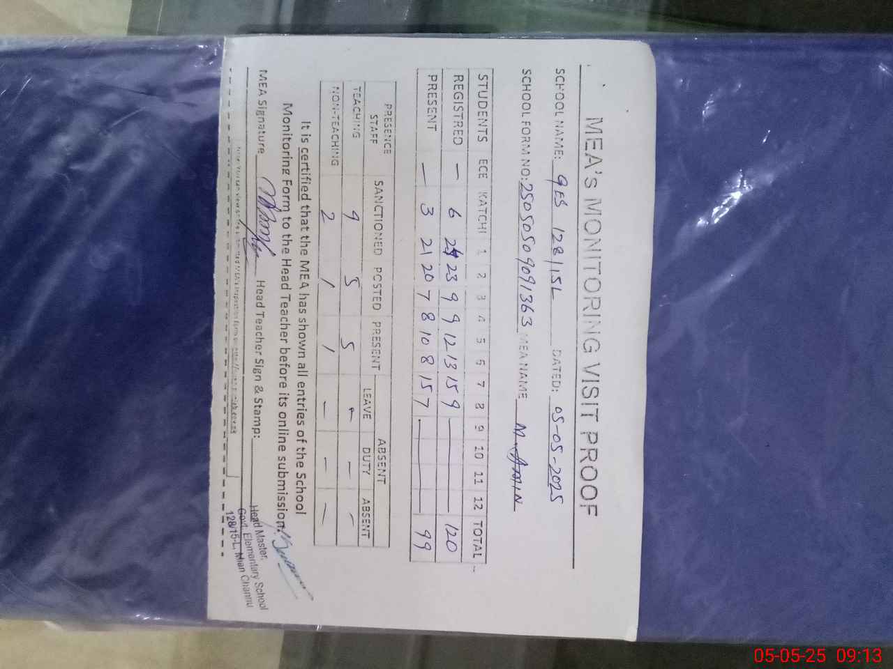 | Attendance Register | Head Teacher | MEA with School | Visit Proof |