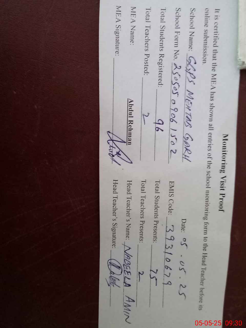 | Attendance Register | Head Teacher | MEA with School | Visit Proof |