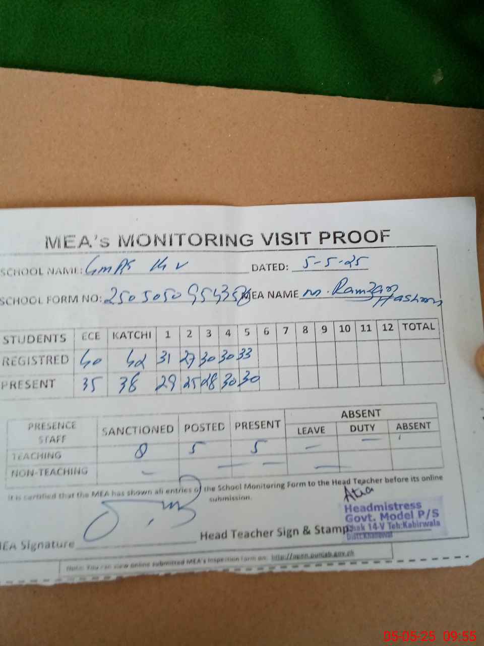 | Attendance Register | Head Teacher | MEA with School | Visit Proof |