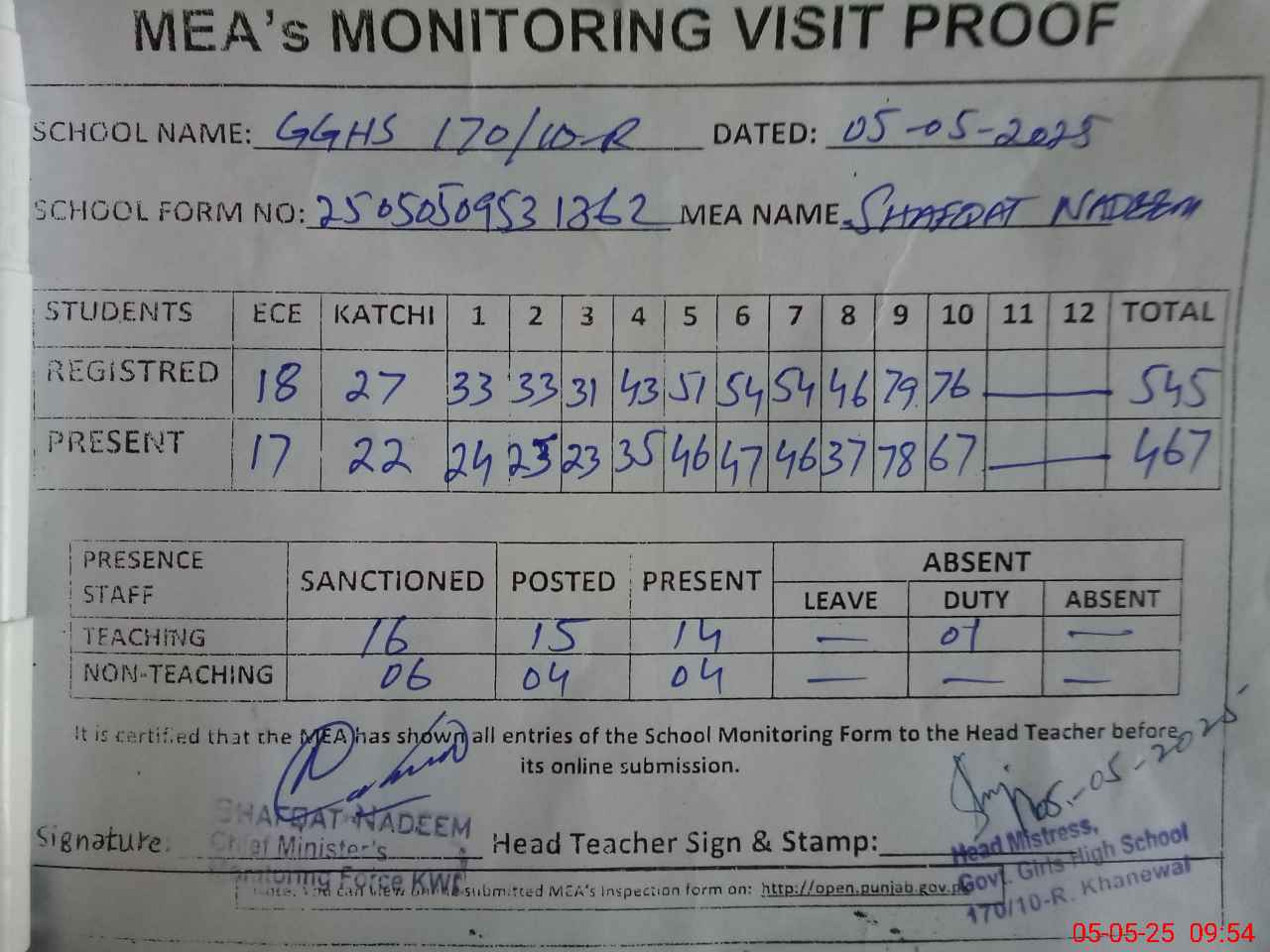 | Attendance Register | Head Teacher | MEA with School | Visit Proof |