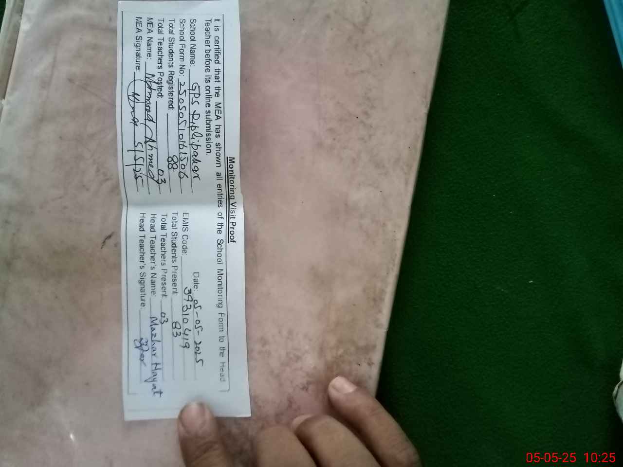 | Certified that this School was Inspected by the Undersigned MEA/DMO Today and the Information Stated Above is as Per Record. | |||||