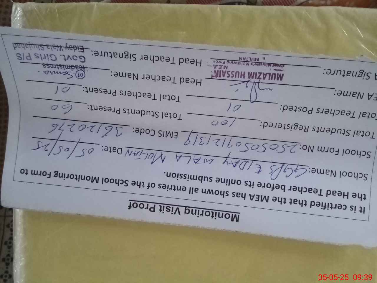 | Certified that this School was Inspected by the Undersigned MEA/DMO Today and the Information Stated Above is as Per Record. | |||||