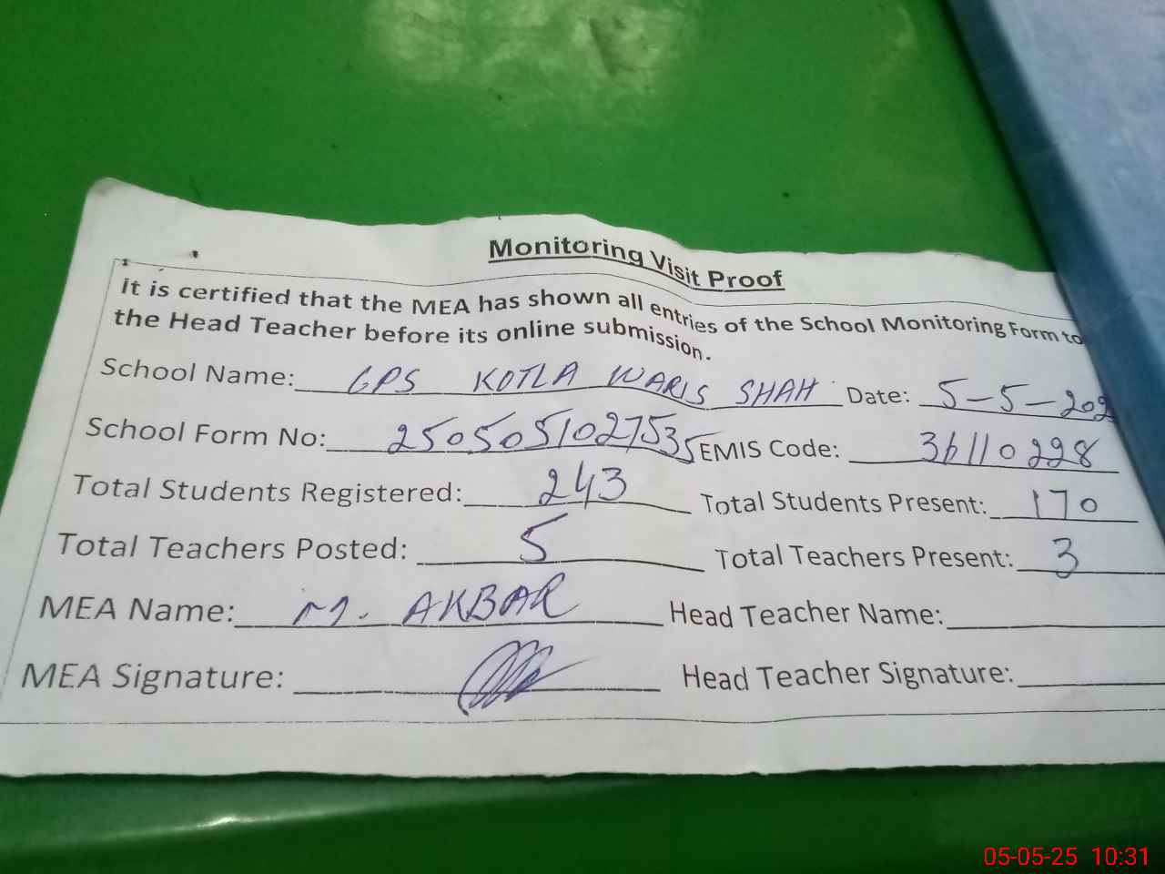 | Attendance Register | Head Teacher | MEA with School | Visit Proof |