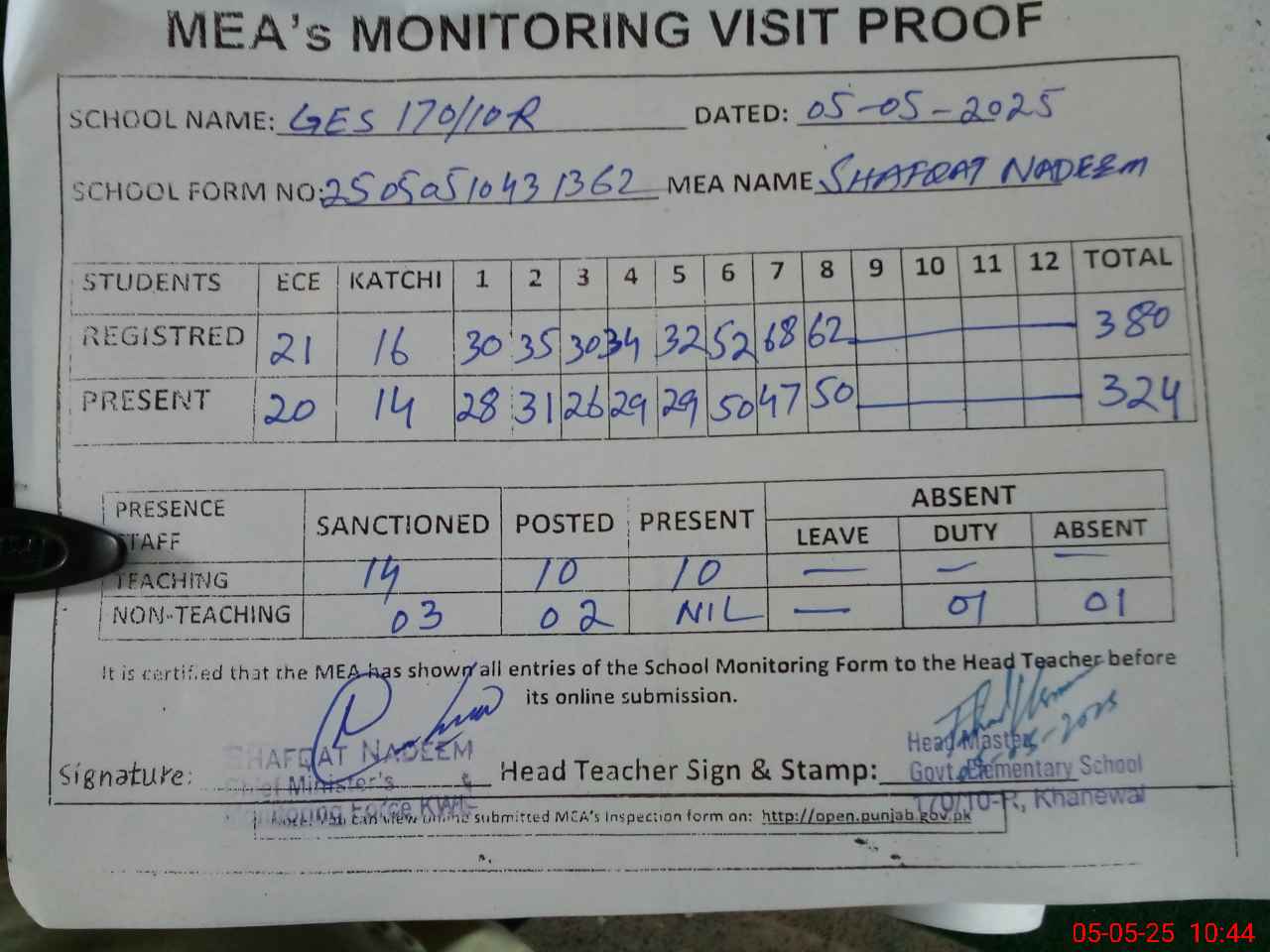 | EMIS Code: 36420069 | Name of School: GES 170/10-R, KHANEWAL | |||