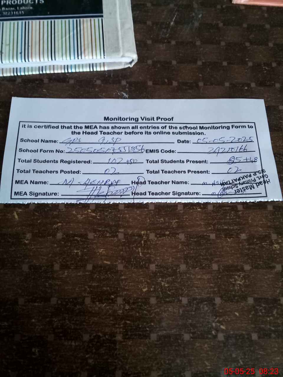| Attendance Register | Head Teacher | MEA with School | Visit Proof |