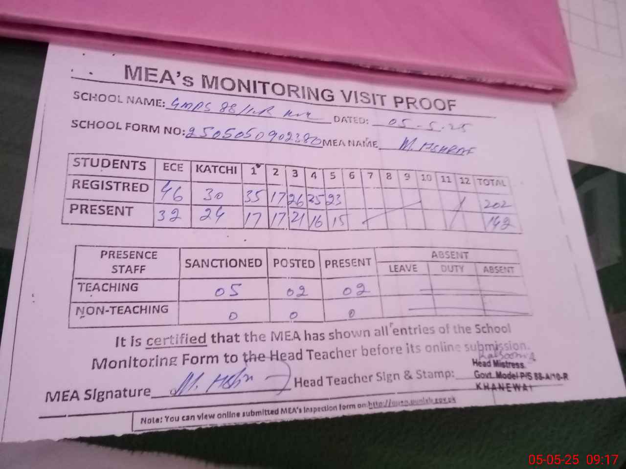 | Attendance Register | Head Teacher | MEA with School | Visit Proof |