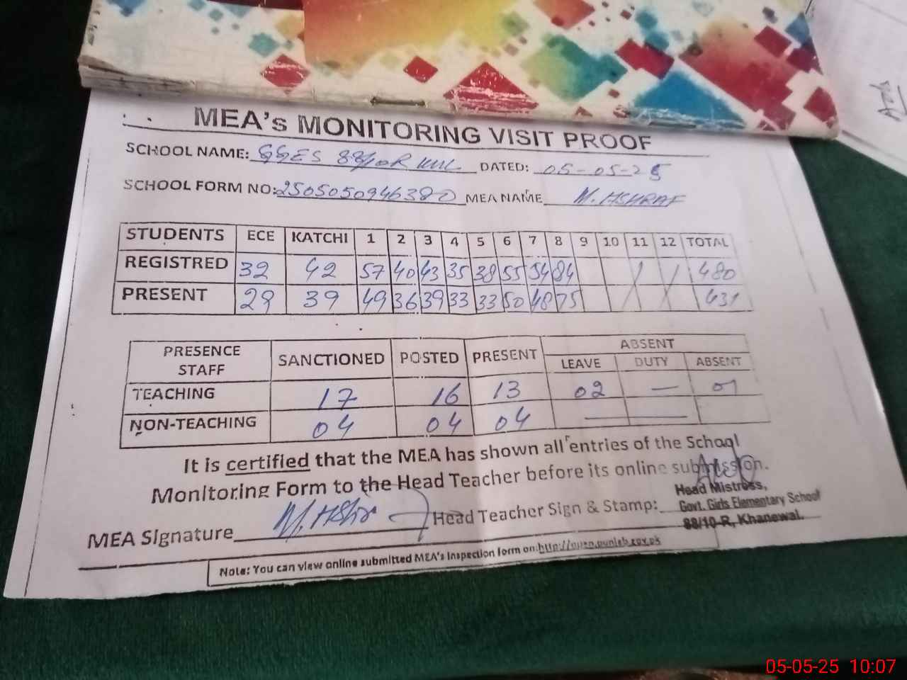 | EMIS Code: 36420109 | Name of School: GGES 88/10-R, KHANEWAL | |||
