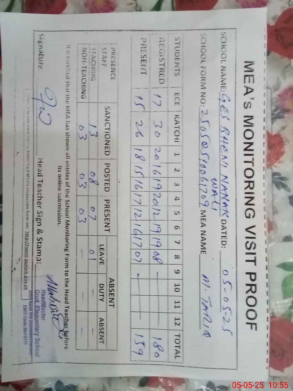 | Attendance Register | Head Teacher | MEA with School | Visit Proof |