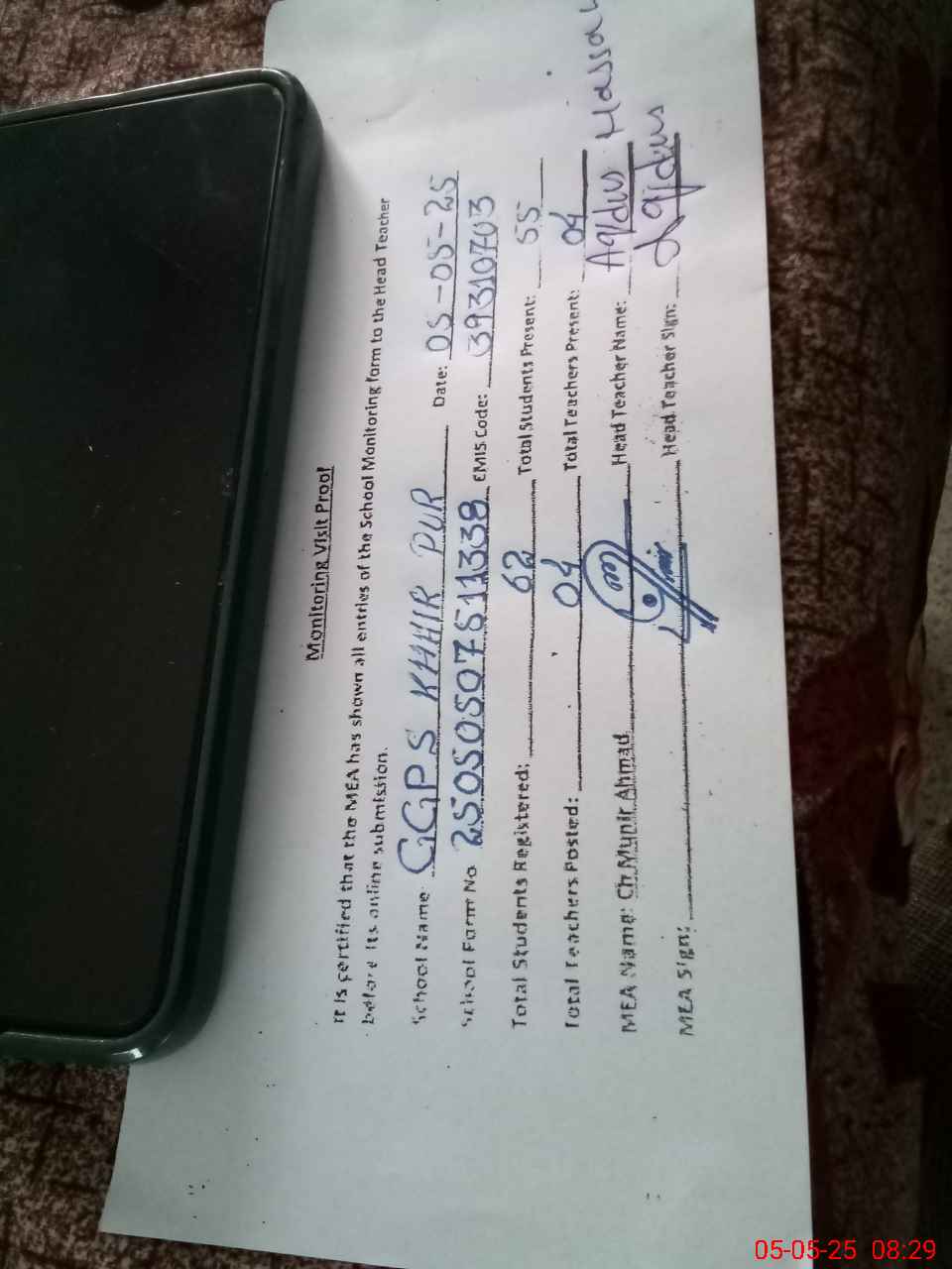 | Attendance Register | Head Teacher | MEA with School | Visit Proof |