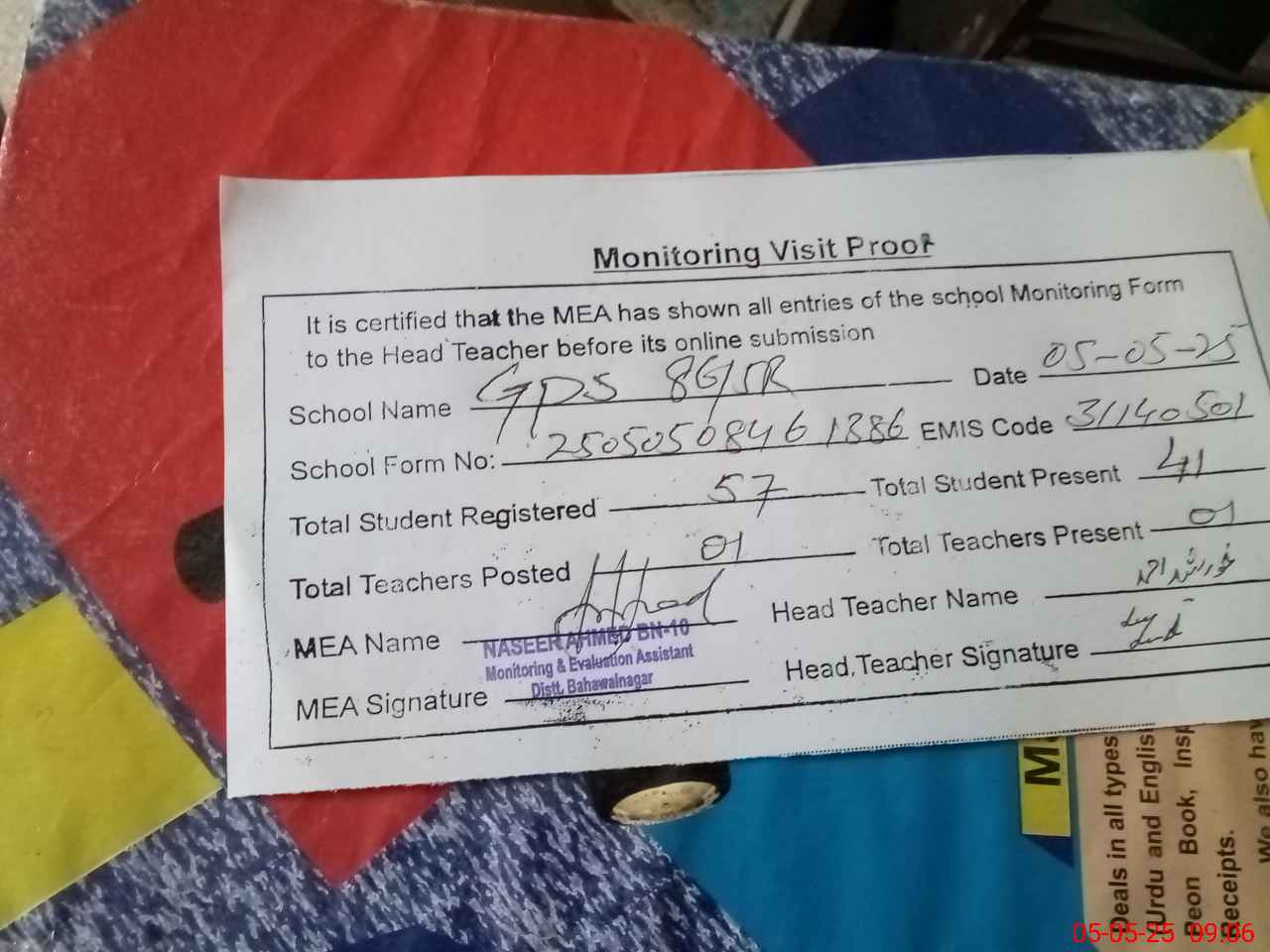 | Attendance Register | Head Teacher | MEA with School | Visit Proof |