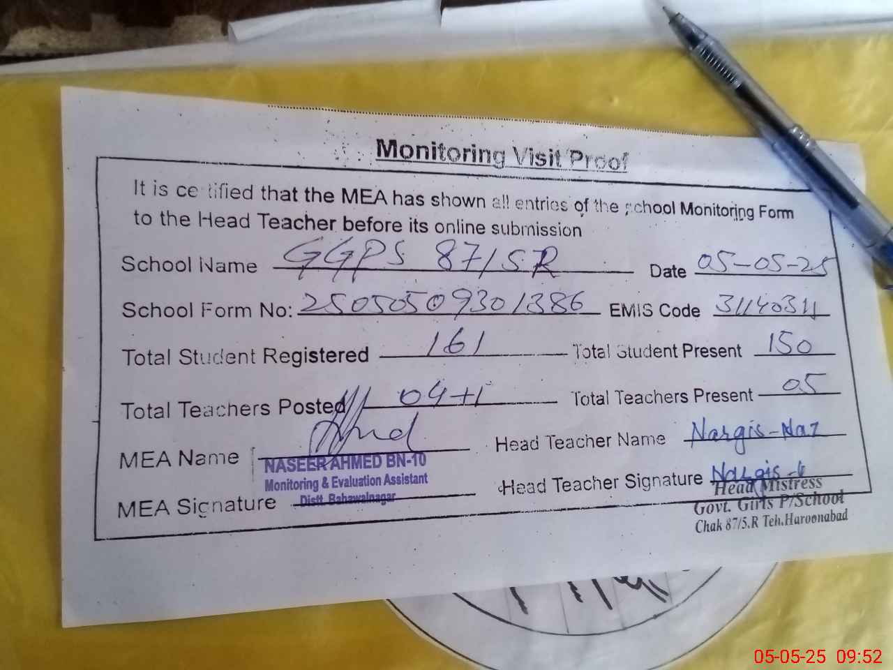 | Attendance Register | Head Teacher | MEA with School | Visit Proof |