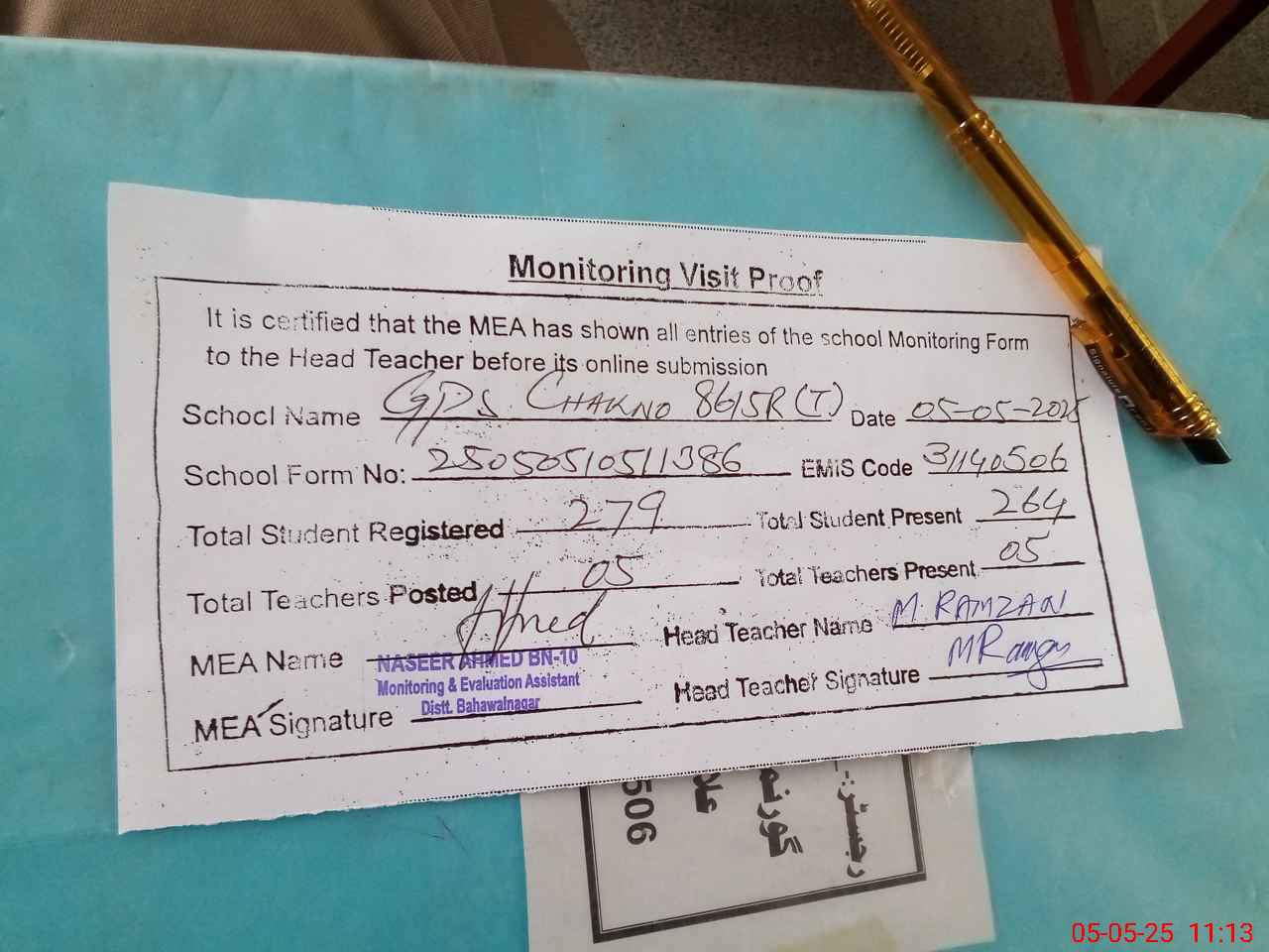 | Attendance Register | Head Teacher | MEA with School | Visit Proof |