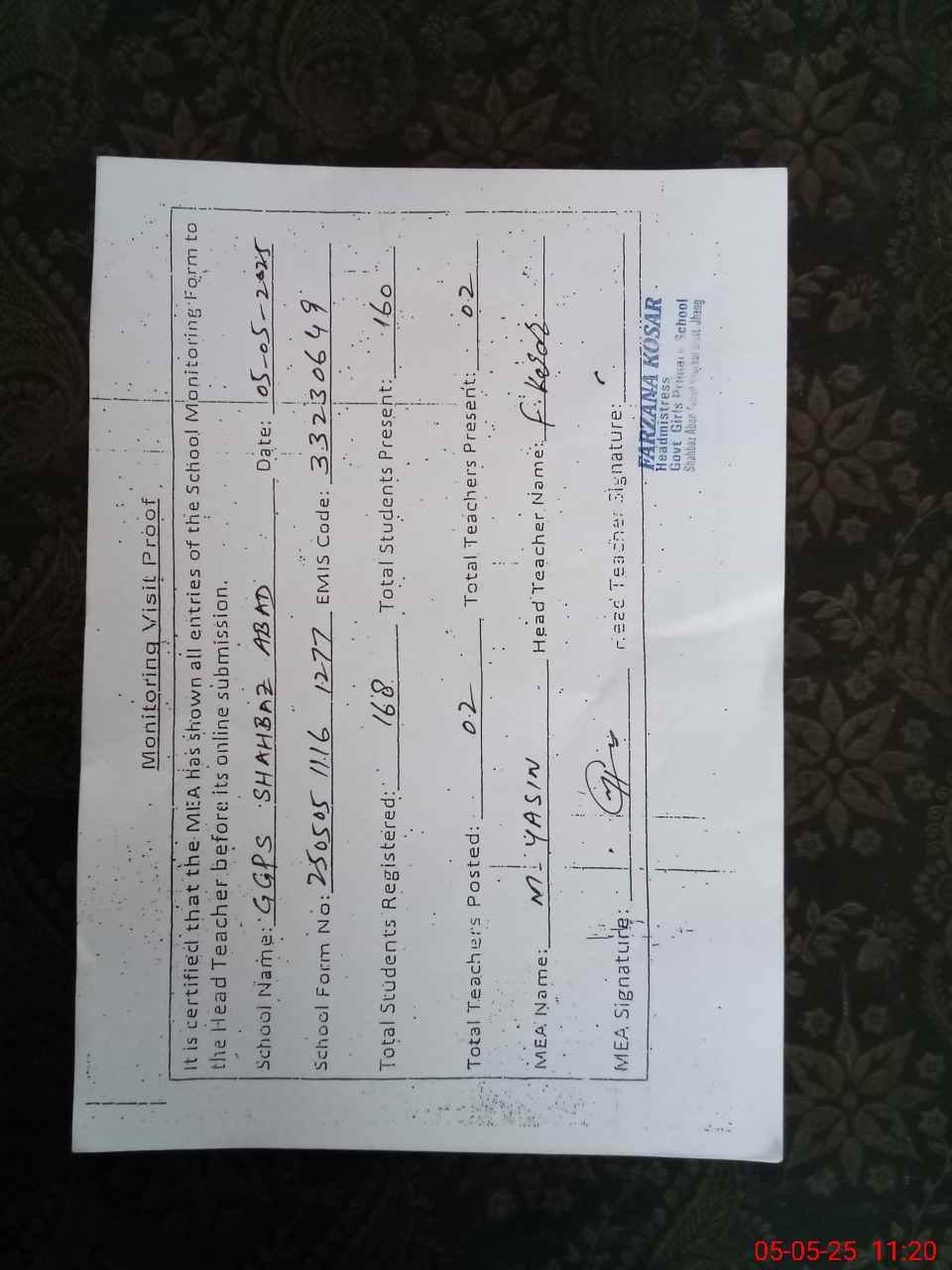 | Attendance Register | Head Teacher | MEA with School | Visit Proof |
