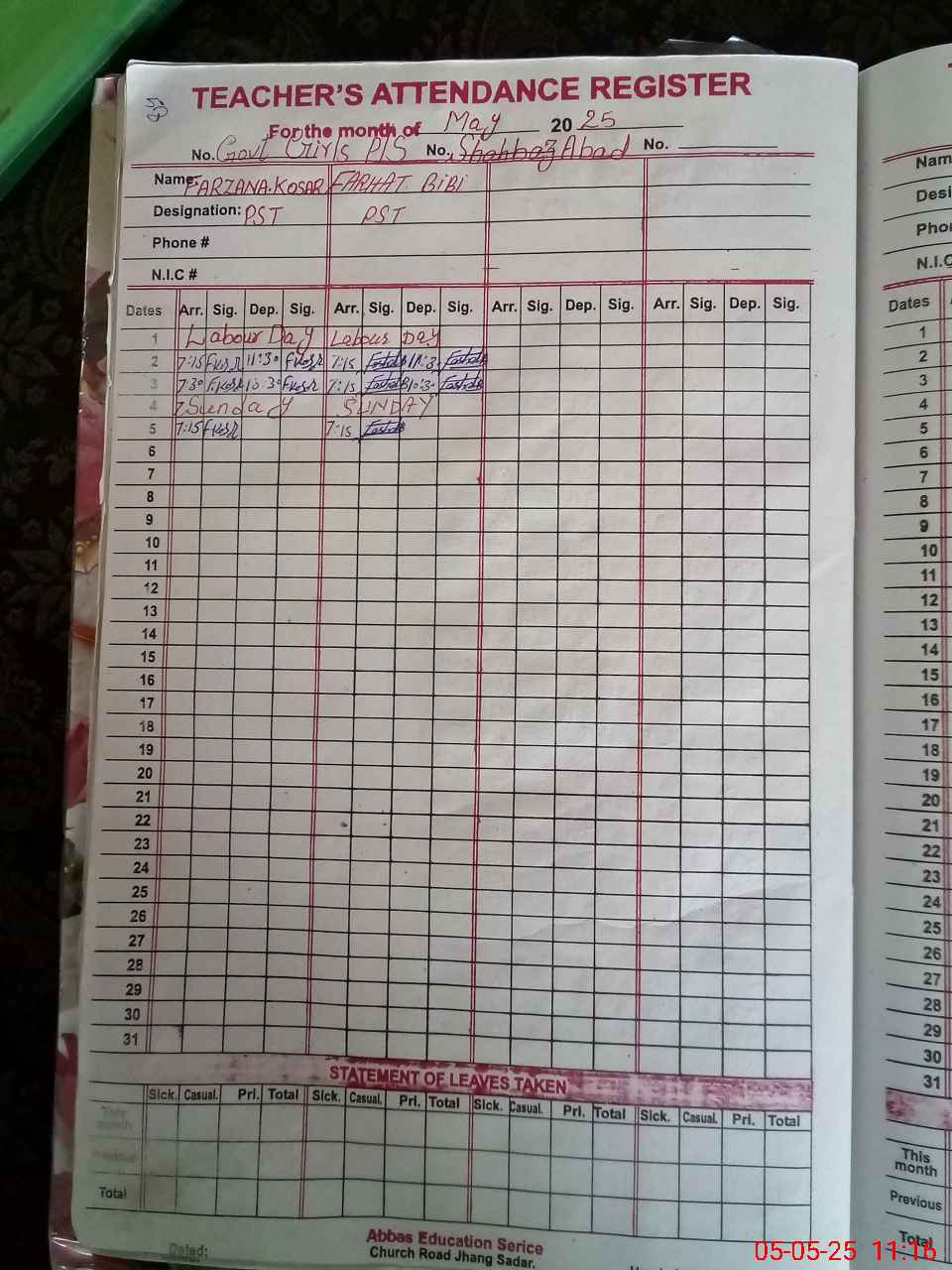 | CNIC | Full Name | Designation | R/C | Absence During Last Calender Month |