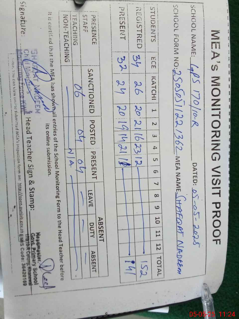 | Attendance Register | Head Teacher | MEA with School | Visit Proof |