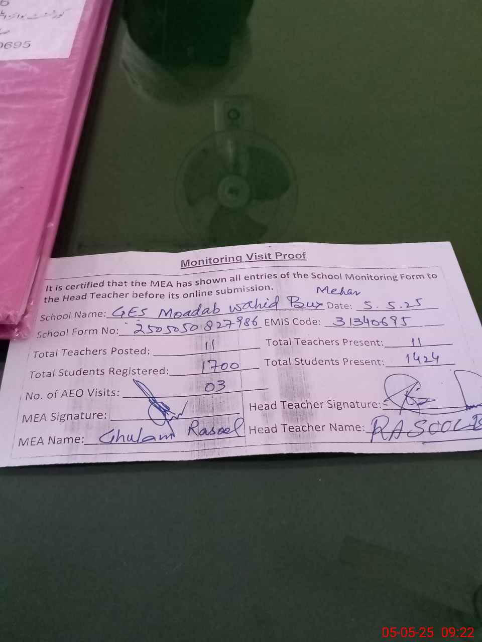 | Attendance Register | Head Teacher | MEA with School | Visit Proof |