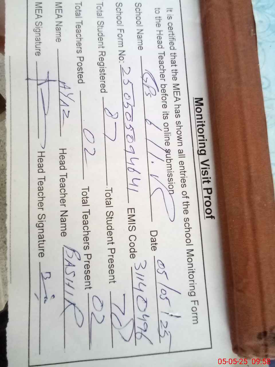 | Attendance Register | Head Teacher | MEA with School | Visit Proof |
