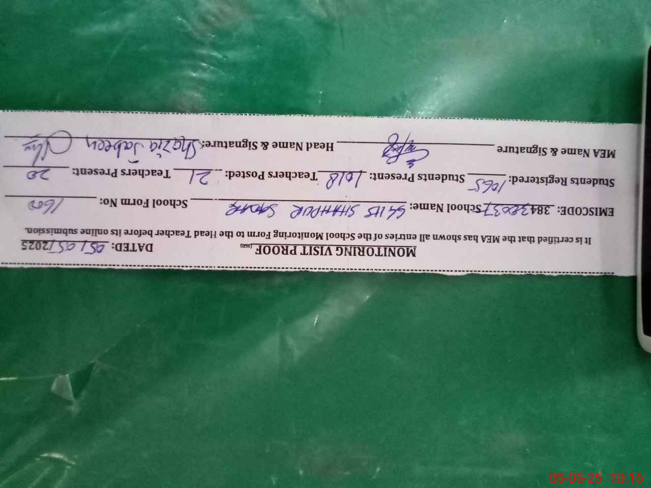 | Certified that this School was Inspected by the Undersigned MEA/DMO Today and the Information Stated Above is as Per Record. | |||||