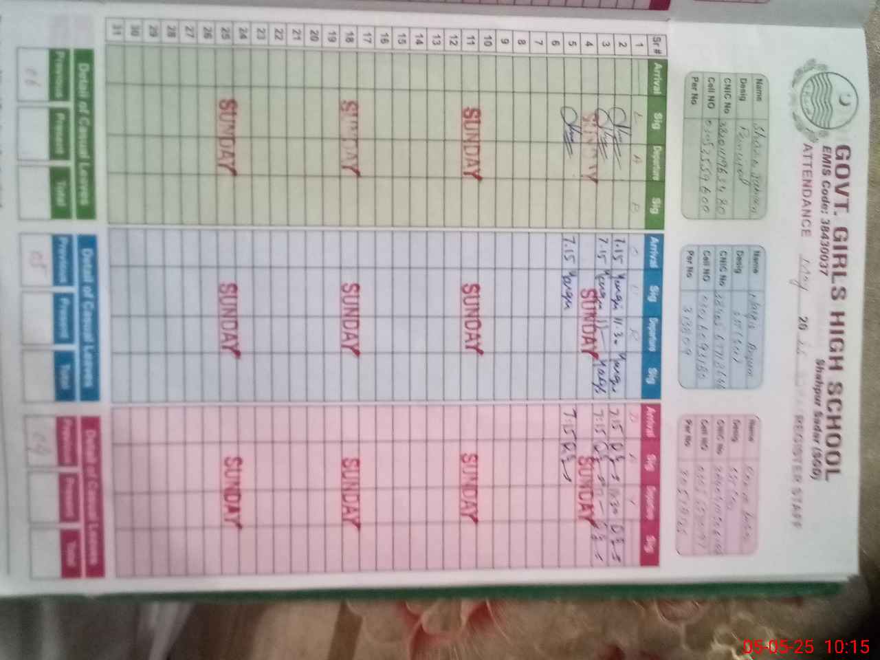 | 38**** | Sa**** Ir**** | 3 | 1 | 0 | 0 | 0 | 0 | 0 | 0 | 0 | 0 | 0 | Exam Duty |