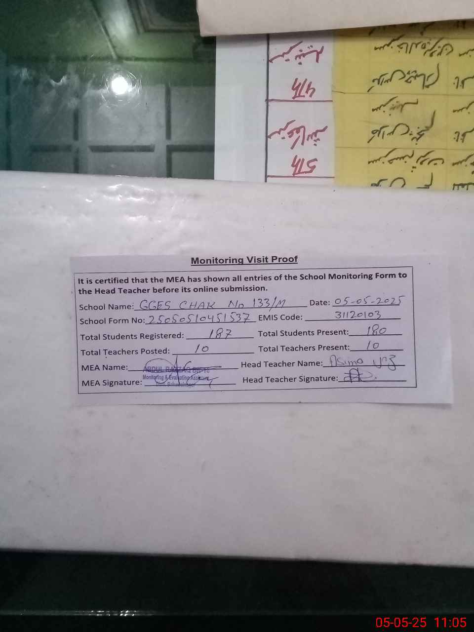 | Attendance Register | Head Teacher | MEA with School | Visit Proof |