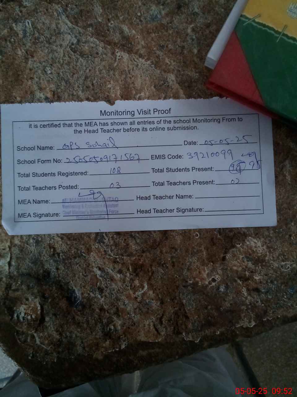 | Attendance Register | Head Teacher | MEA with School | Visit Proof |