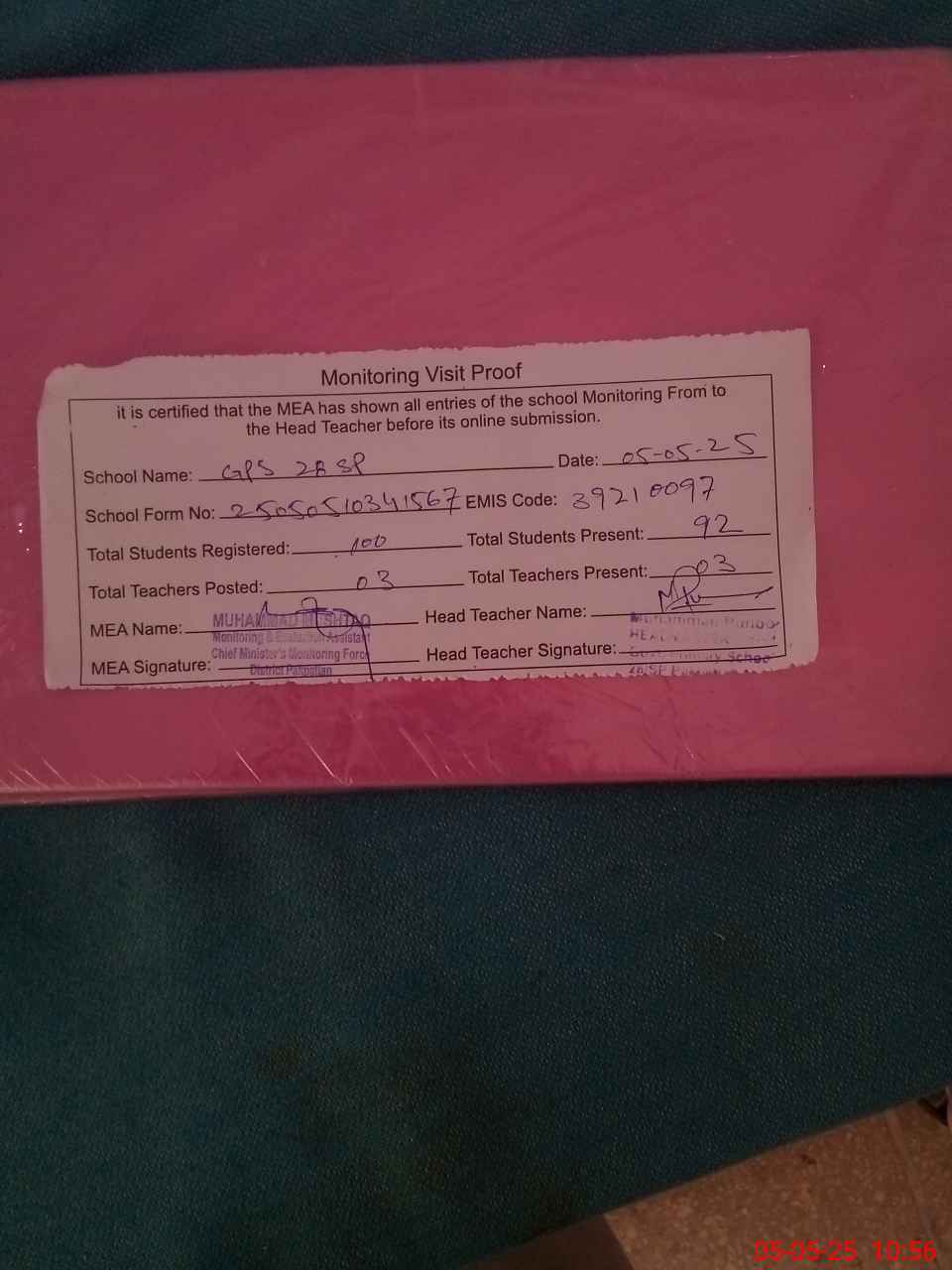 | Attendance Register | Head Teacher | MEA with School | Visit Proof |