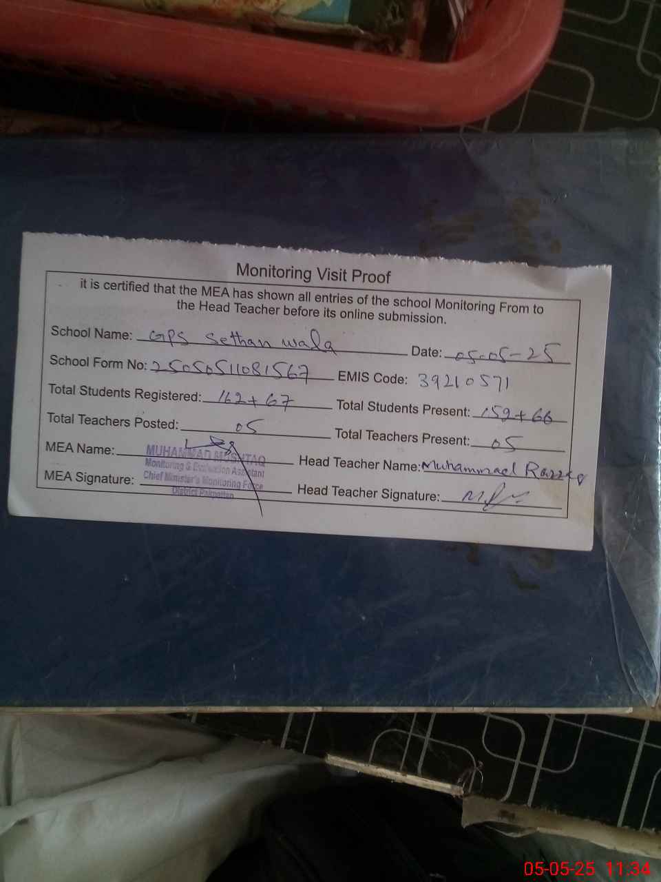 | Attendance Register | Head Teacher | MEA with School | Visit Proof |