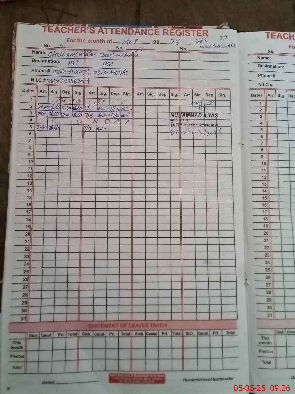 | Name: ZE**** AM**** Designation: (School Headmaster's/Headmistress's) ESE (SCI MATH ) Phone/Cell Number: 03**** |